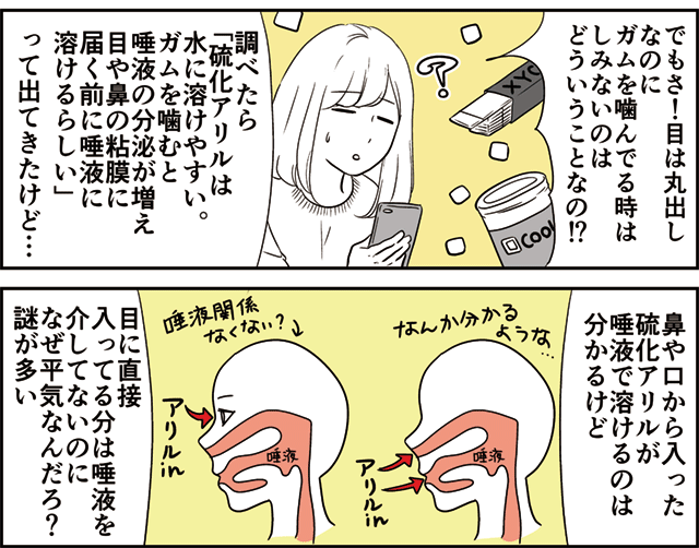 涙が少ない状態だと、眼球に付着した硫化アリルは水に溶けることなく揮発して刺激を受けることがない。
