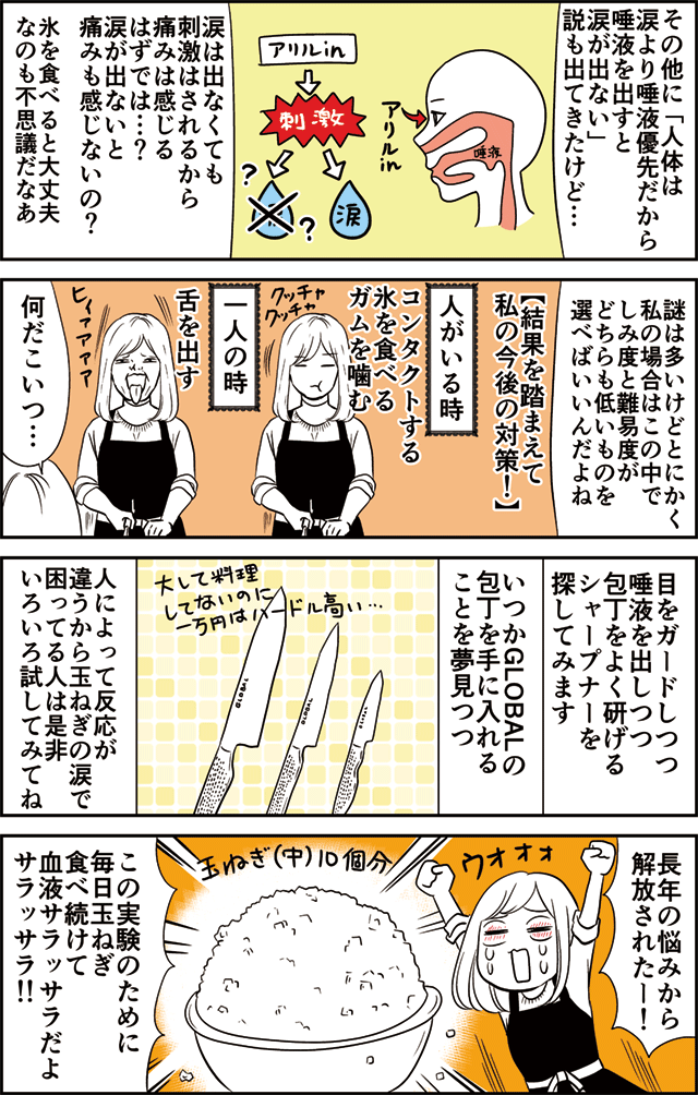どうしても、玉ねぎを切ると目がしみて辛い私。泣かない方法を見つけるため、玉ねぎを切りまくって実験してみたよ。謎が多い硫酸アリル…そして実験結果を踏まえて、私が今後取る対策は…