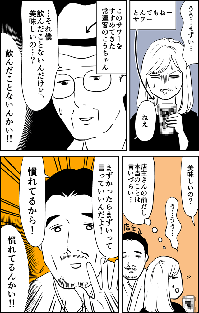 店で出会った常連のこうちゃんっていうおじさまに、とんでもねーサワーをおすすめされて飲んだんだけど、とんでもねー味だったよ!!苦しみながら飲んでたら…