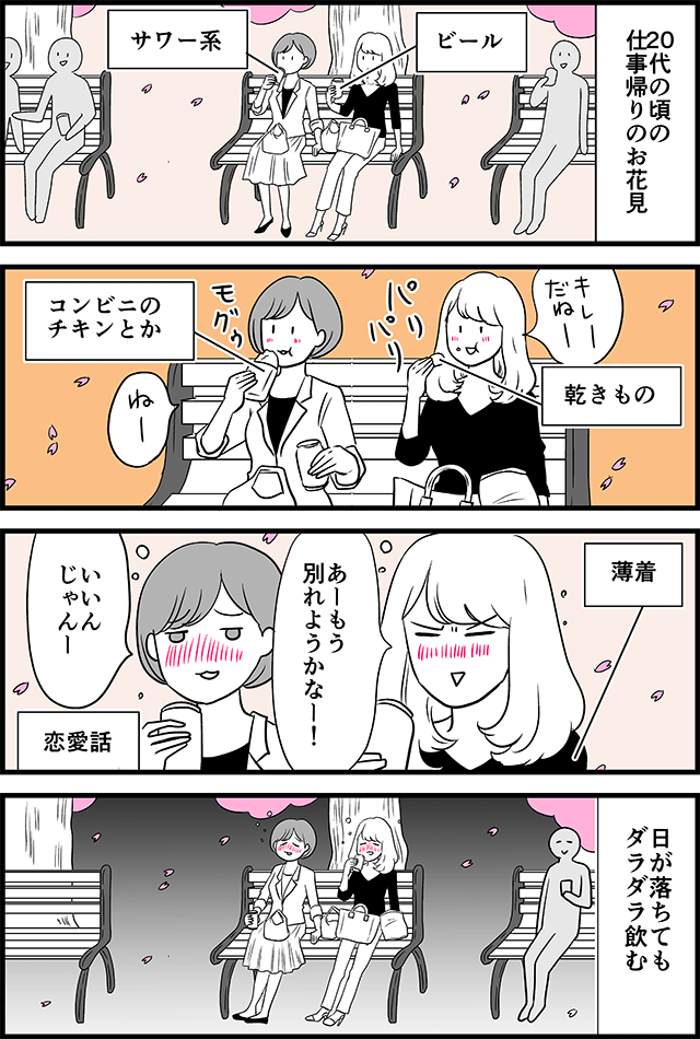 先週、仕事終わりに軽くお花見してきました。そしたら、自分のお花見ぶりが昔とだいぶ変わったなーと思ったので、描いてみます。