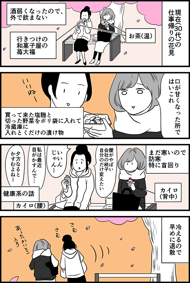 でも大人(というかなんかおばあちゃん)の花見も美味しいし楽しいよ!冷え性だけどうにかしたいけど。みなさまの「何かの帰りに軽く花見(ちゃんとした花見じゃなく)」はどんな感じなのかな?あと、4年目にしてやっと念願の苺大福食べられたよ!!!コメントで「今年は食べられましたか?」ってリマインドしてくれた方、ありがとう!おかげで2回も買って食べられたよ~~