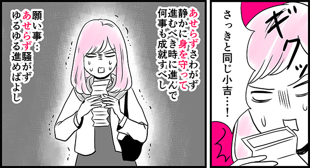 私もはやく何とかしたいのに、「じっと待て」とかの小吉ばかり、数年間続きました!