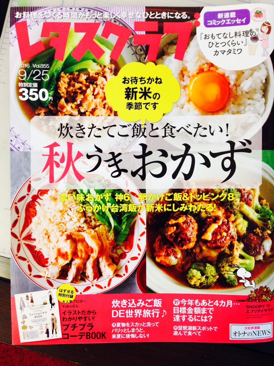 あと、この号の特集「炊きたてご飯と食べたい!!秋うまおかず」と 「おかずのカレンダー」というコーナーは、私の担当編集加藤さんが携わっているよ。あの舌の肥えた加藤さんが、試作して「抜群に美味しい」とおっしゃってるので間違いなく美味しいはず、しかも難しいレシピはないので、私も作ってみようと思います!