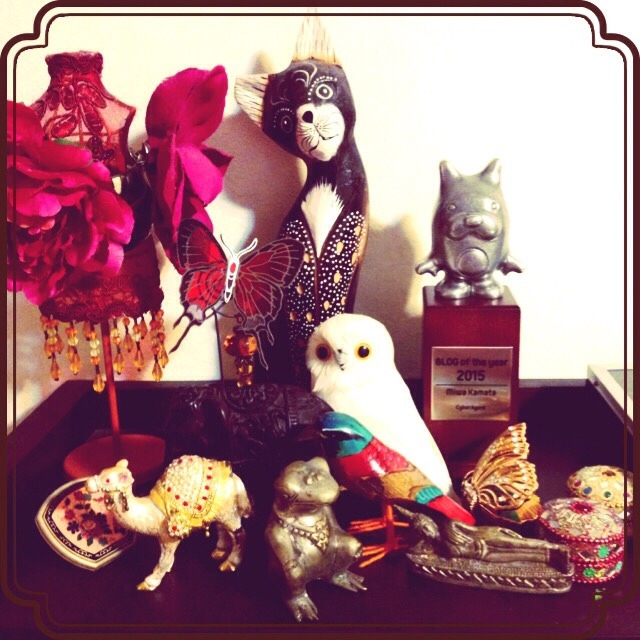 私、アジアンな動物の置物が好きでつい集めてしまい、本棚の一角がそれらの陳列ゾーンになってるのですが、アメーバさんから頂いたトロフィーが妙にしっくり来てない?