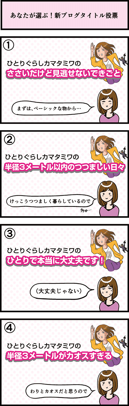 早速ですが、タイトル案を発表します。一人暮らしネタが増えそうなのと、覚えづらい名前を覚えて頂きたいという欲望から、全ての案の最初に「ひとりぐらしカマタミワの」をつけました。文字だけだとイメージが沸きづらいかと思い、タイトルイラストと組み合わせた画像を簡単に作ってみましたので、私のコメントと共にご覧ください~